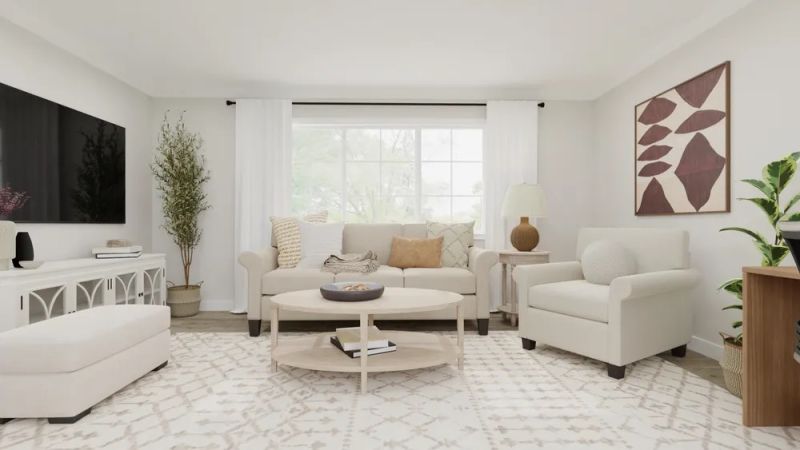 Pop in some contrast: A black coffee table, deep navy cushions, or even a dark-stained wood sideboard can anchor the space and keep it from feeling too “floaty.”
