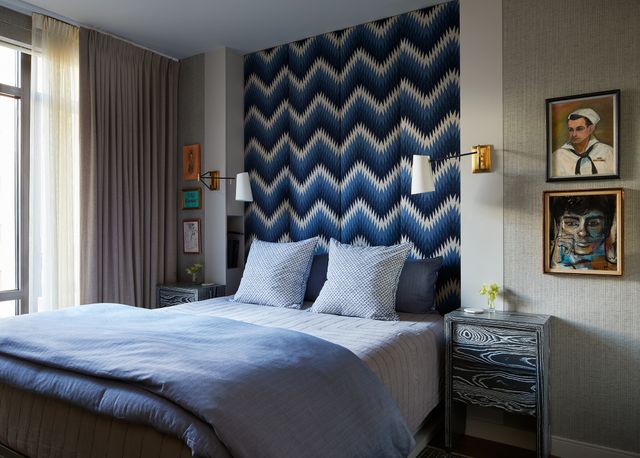 This blue-hued paradise is a treat to the eye no matter where you look at it. Beautiful shades of blues are scattered across the apartment in different textures and finishes to create a cohesive look, even in details like the bedside tables from Aronson Woodworks, shades of blue hide behind the washed-out wood veins. Even in the guest bedroom, you’ll find subtle hints of blues. But, it’s the mix of textures, styles, and finishes that make this apartment genuinely unique.