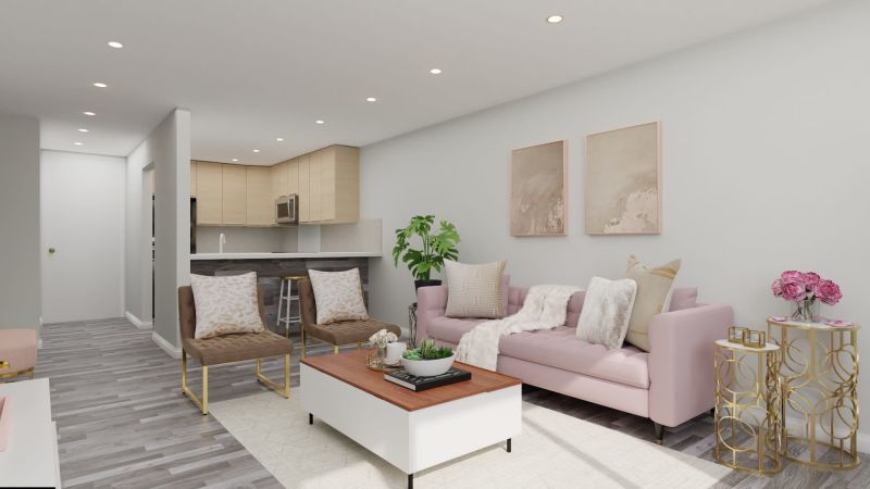 This compact living room looks spacious due to the carefully chosen wall colors, furniture layout, and decor items. The pink sofa from Living Spaces perfectly complements the white walls, and combined with minimal decor softens the room. The large window panes provide ample natural light, making the room appear larger.