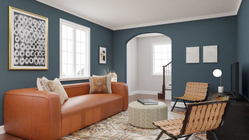 The focal point of this modern urban living room is the tan leather sofa. It beautifully contrasts with the blue walls and gives this small living room a clean look. The minimalist furniture and decor come together to give the living room a spacious look. Perfect for someone who desires minimal modern-urban aesthetics.