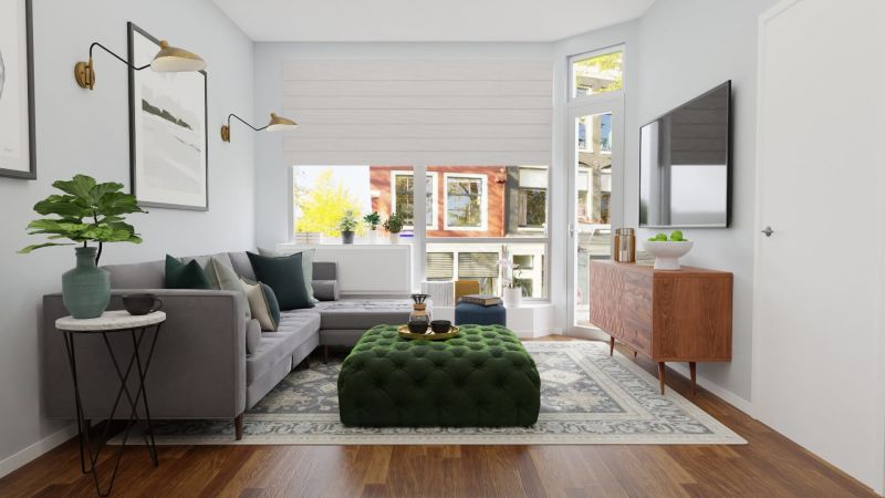 This mid-century modern living room is small yet has a glam look with a soft grey chaise lounge sofa that is paired with an oversize jewel green tufted ottoman. The hanging scones are a real space saver and cast bright lights across the room. Large windows with flexible Roman shades make the room appear larger.