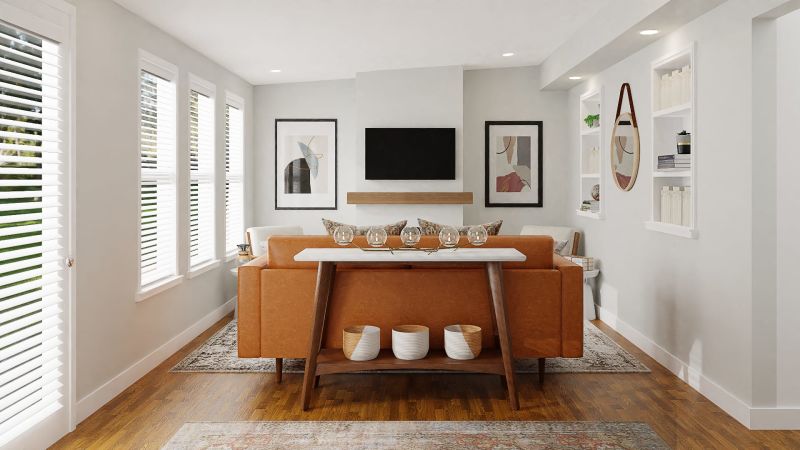 While this mid-century modern living room is small, it has all the necessities in place. Ample seating space, bookcase, media console, TV, coffee table, etc. The walls are filled with minimalist prints. A contemporary round mirror on the wall reflects the light from the window, making the room appear larger.