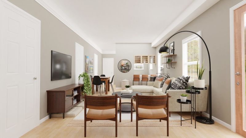 This multi-functional room design is perfect for homes that have narrow living rooms. The overall color palette has warm neutrals with black pops to create a classic mid-century contrast and a better flow across the open space layout. The large window panes and the glass door provide lots of natural lighting.