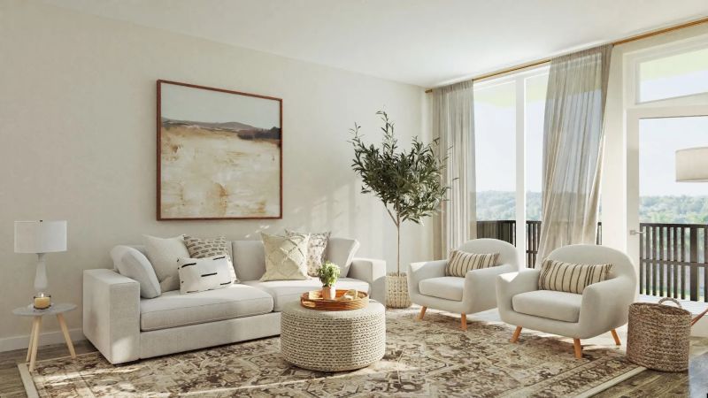 Pop in some contrast: A black coffee table, deep navy cushions, or even a dark-stained wood sideboard can anchor the space and keep it from feeling too “floaty.”